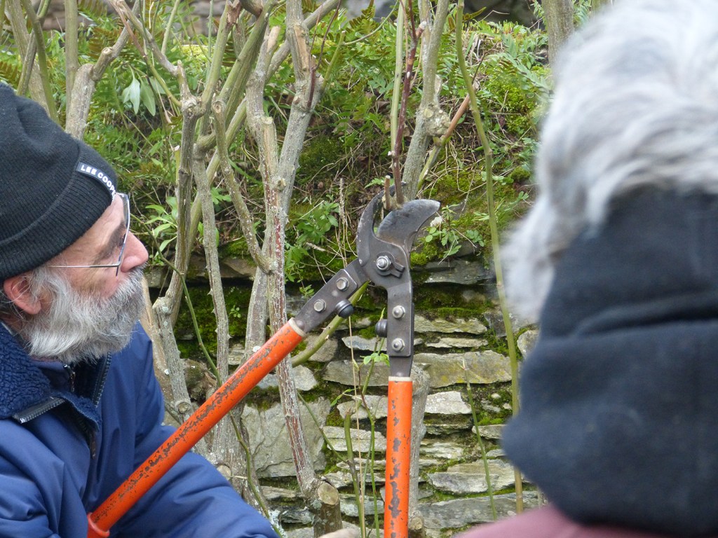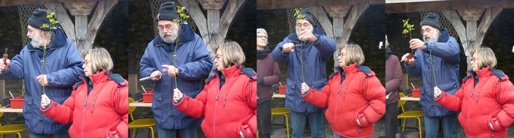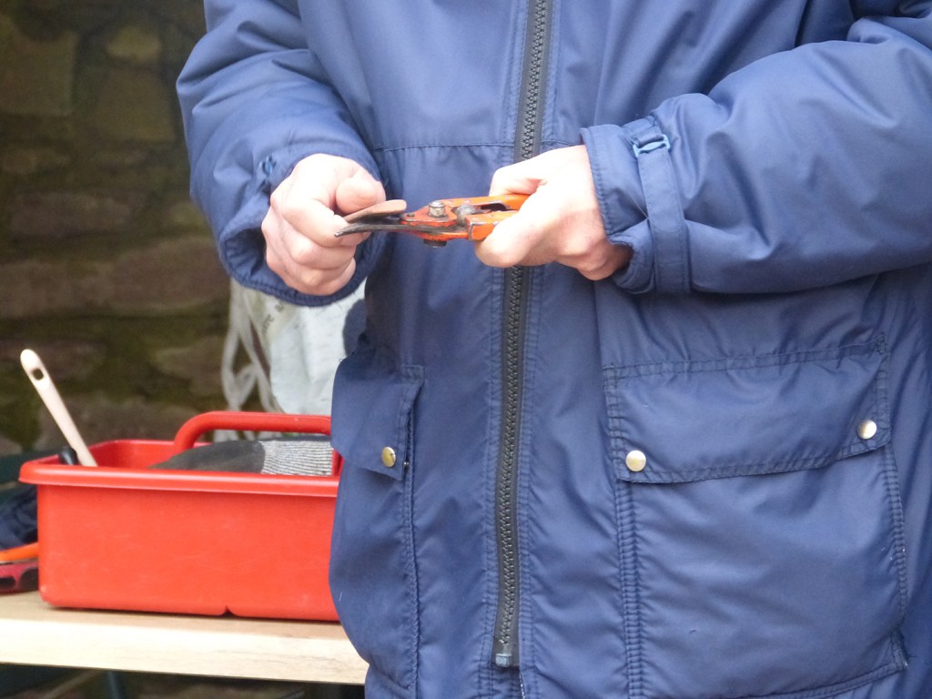 Gilles et Mireille commencent toujours l’atelier de taille de rosiers par une présentation des outils et de leur maniement.