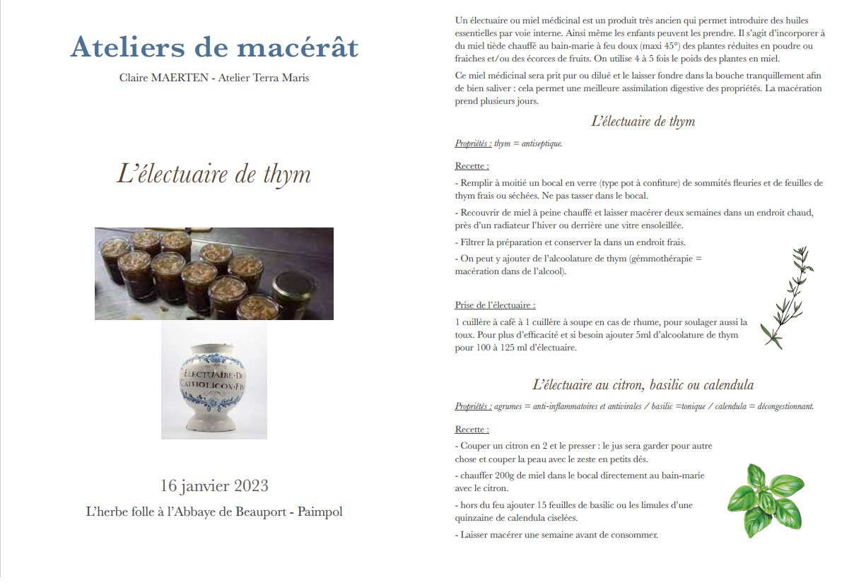 Claire Maerten (Atelier Terra Maris) propose aux bénévoles de l’Herbe Folle la réalisation d’un électuaire de miel au thym. Un remède connu et reconnu par nos grands-mères !