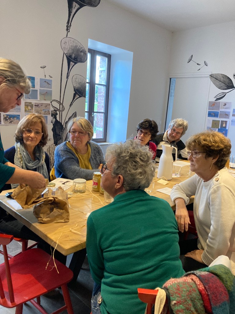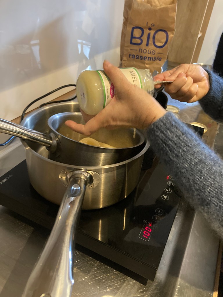 Claire a guidé pas à pas les volontaires présent.es dans la réalisation de ce miel aux vertus médicinales, parfait pour guérir les petits maux de l’hiver !