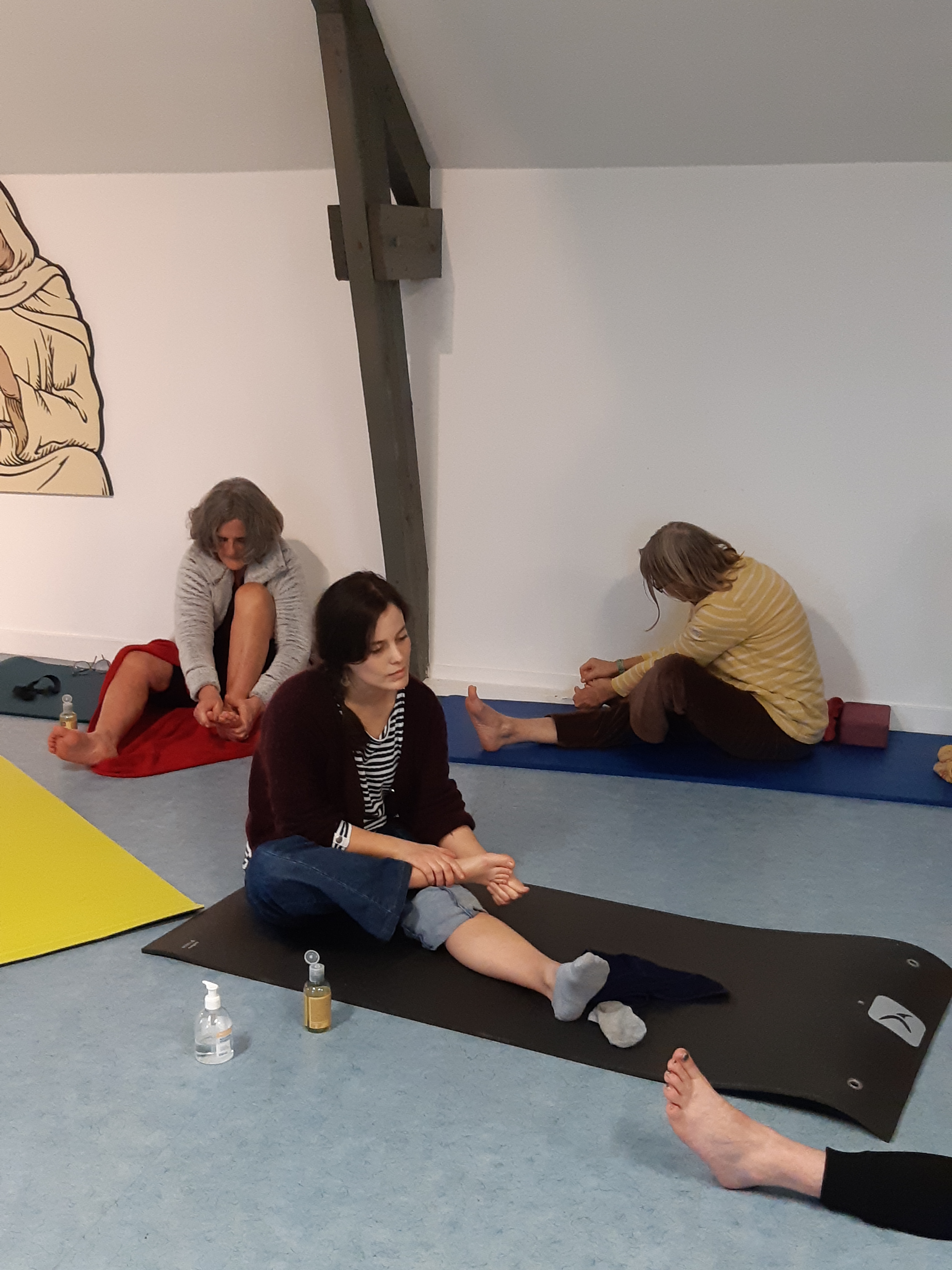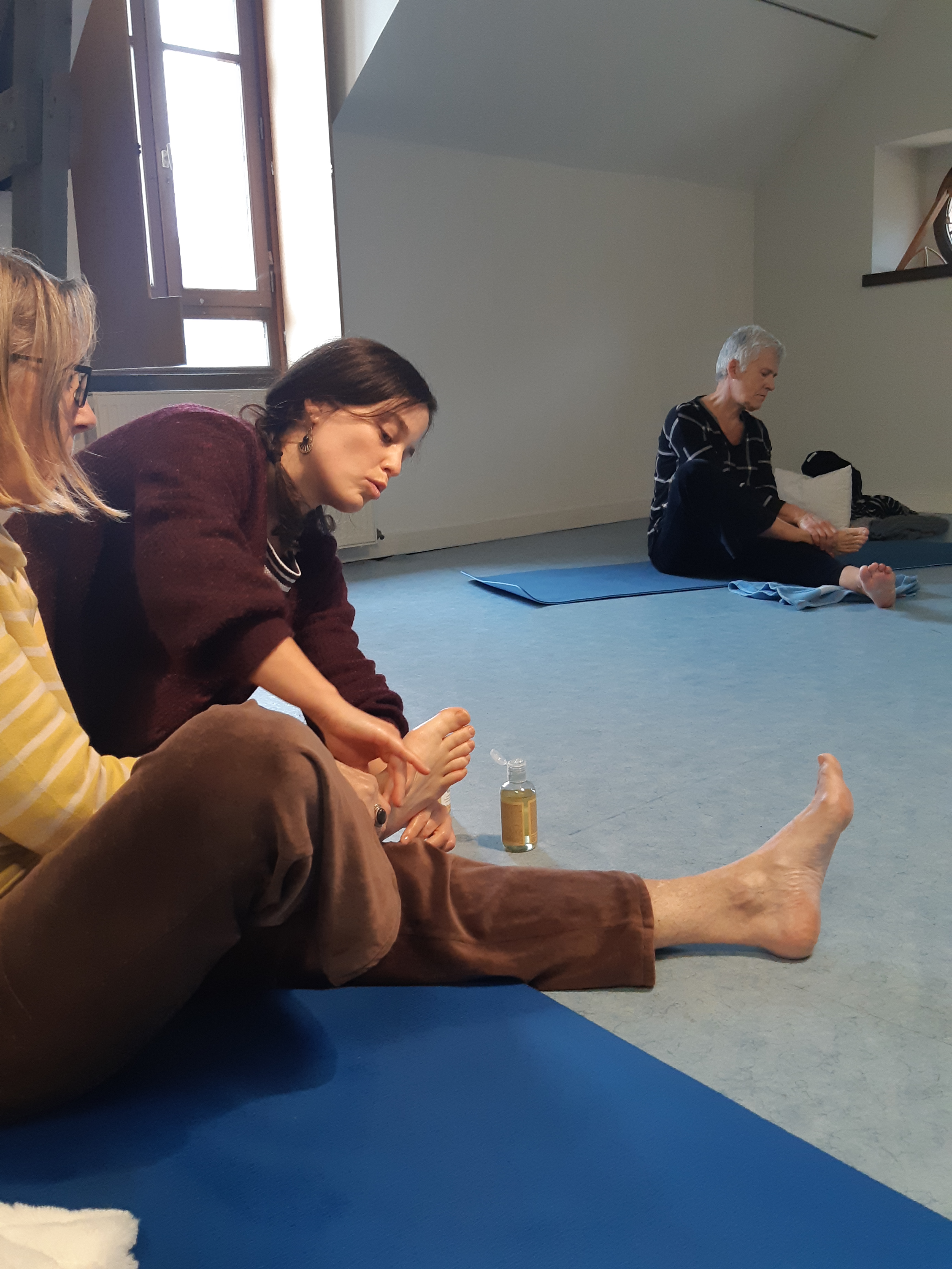Munies d’un flacon d’huile d’amande douce, les participantes ont pu apprendre à pratiquer l’auto-massage. Prenant pour point de départ la pratique de la réflexologie plantaire et palmaire, Aurélia a pris le temps de montrer à chaque volontaire les différents points principaux sur lesquels appuyer pour dénouer une tension ou soulager une douleur.