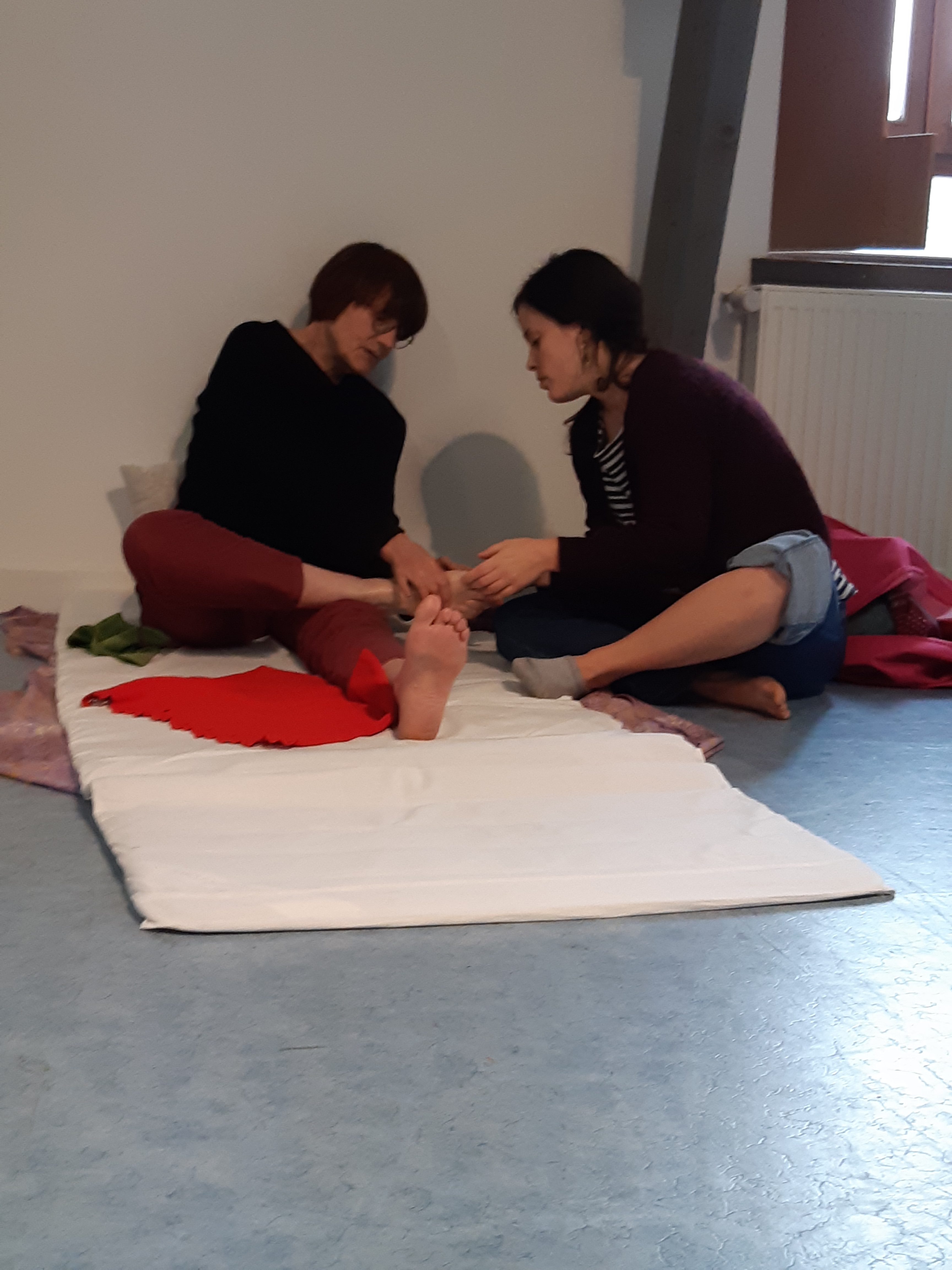 Cet hiver, aux côtés d’Aurélia Wolff, les bénévoles de l’Herbe Folle ont pu se former aux gestes pour prendre soin de leur corps de manière autonome.