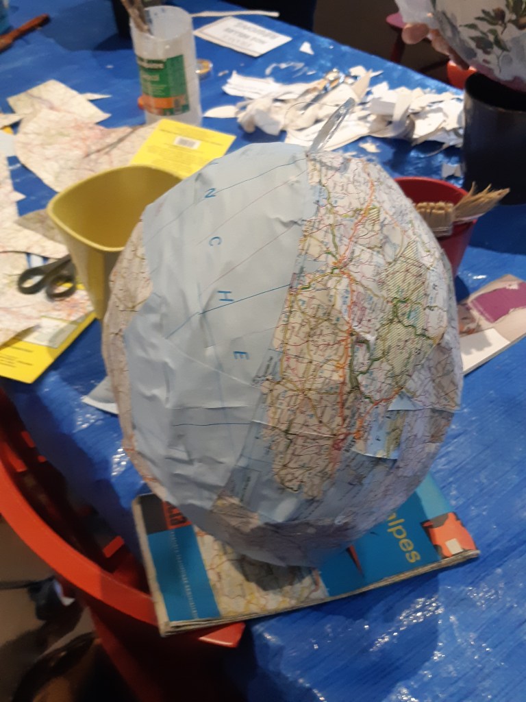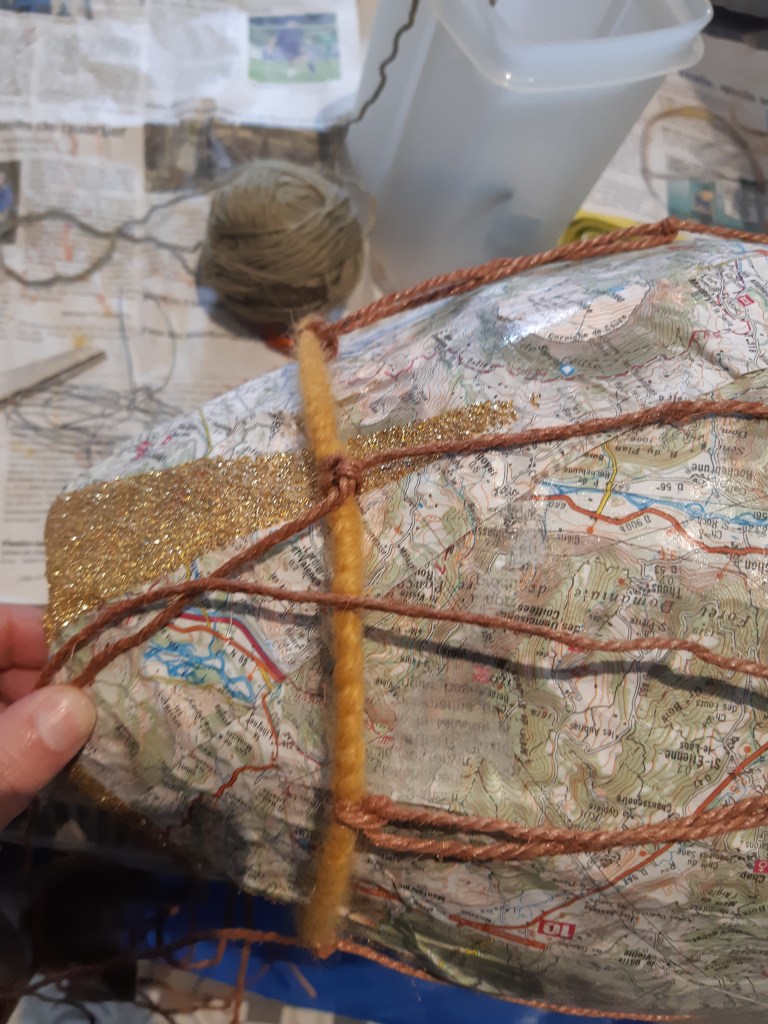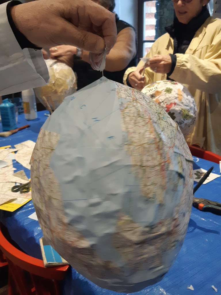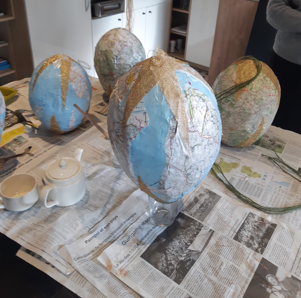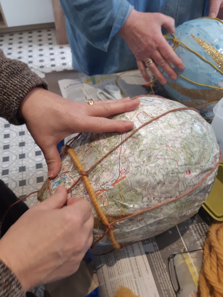 Pour parfaire la décoration des montgolfières, nous avons utilisé d’anciennes cartes routières ou maritimes, une évocation nostalgique du voyage.