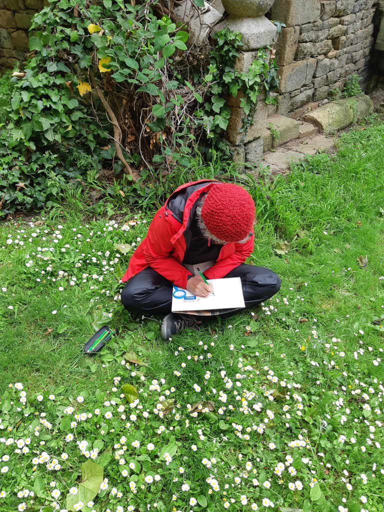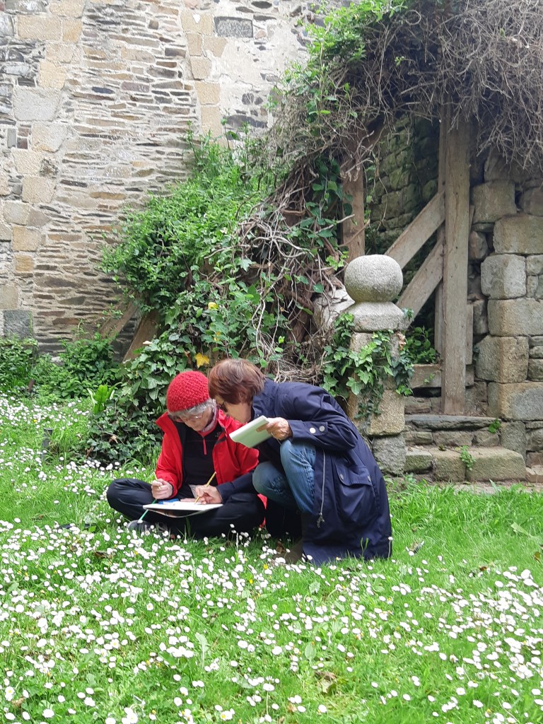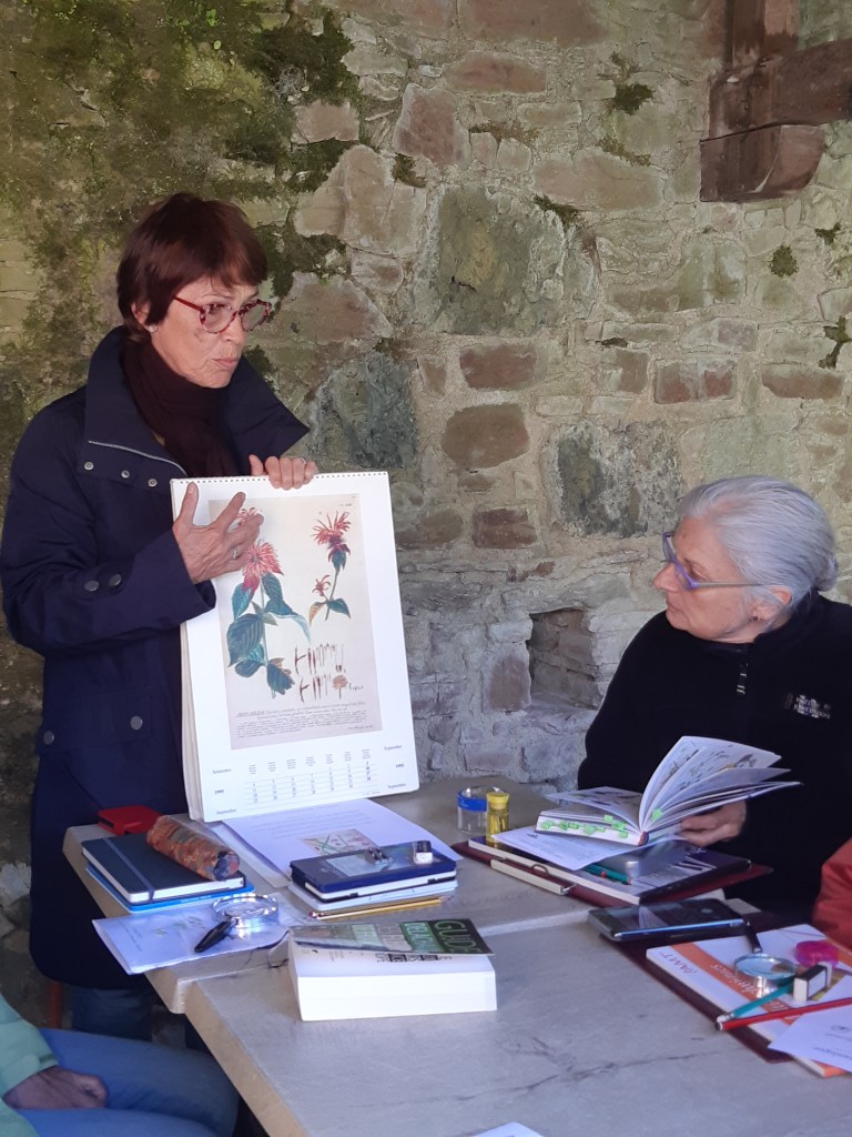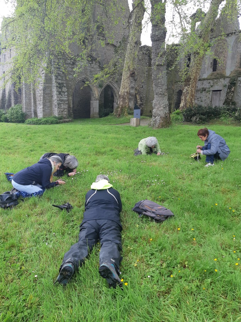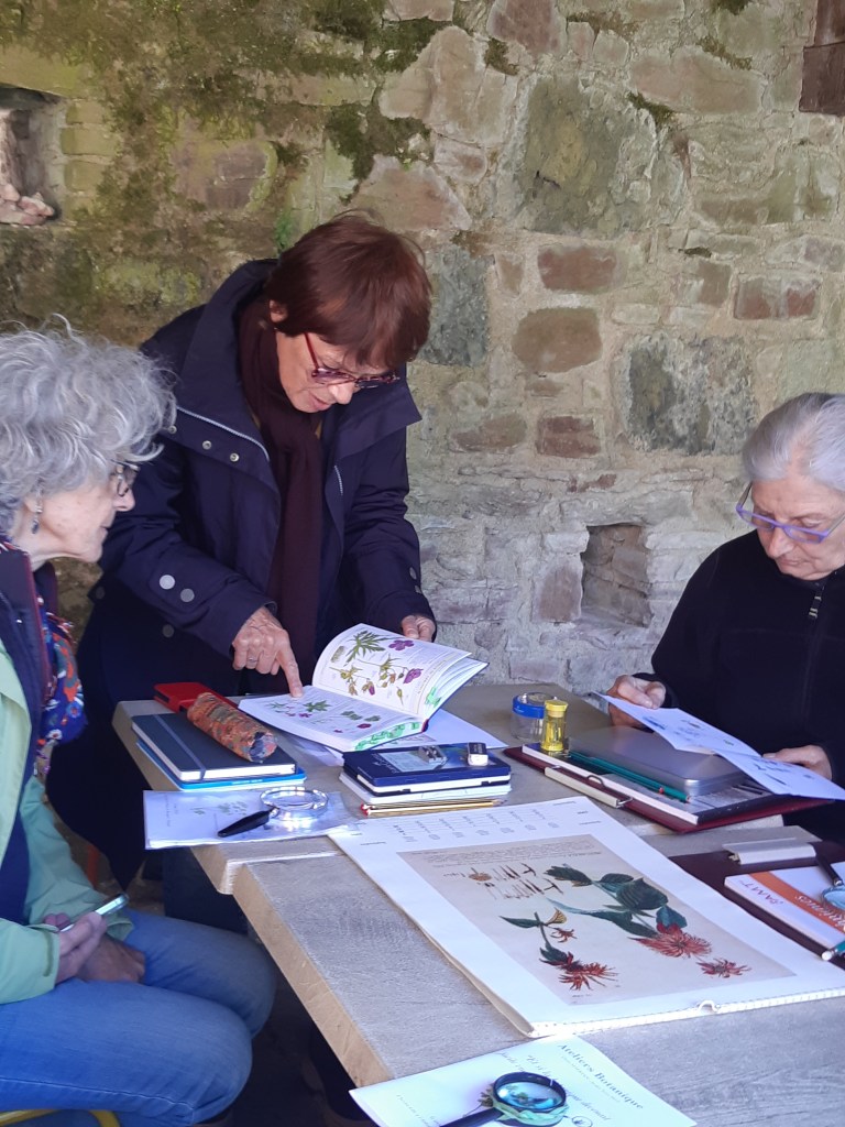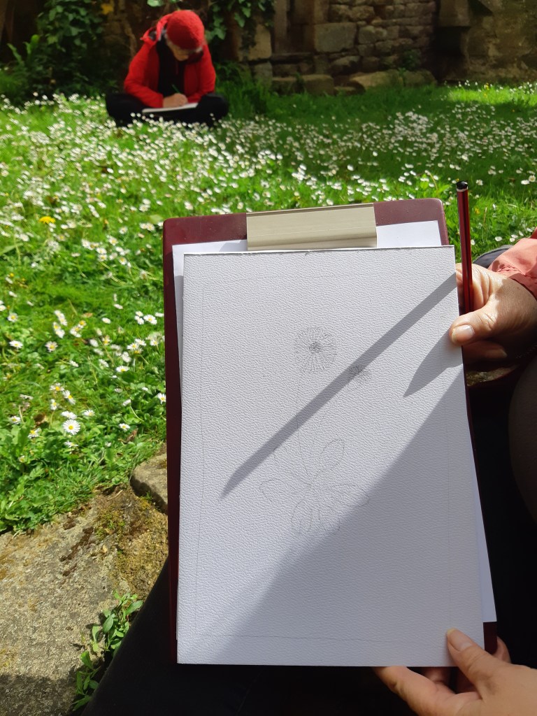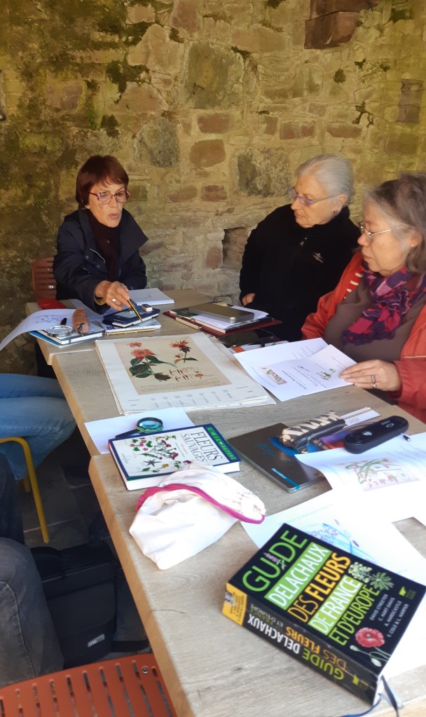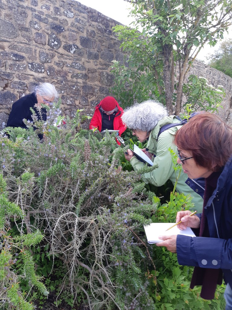 Après une discussion plus théorique autour d’une boisson chaude, les participant(e)s ont ensuite pu arpenter différents espaces de l’Abbaye, muni(e)s de leur loupe, de leurs crayons et de leur carnet pour apprendre à observer et dessiner les fleurs qui jonchaient le sol, que cela soit les pâquerettes du chauffoir, les buglosses du jardin des simples, ou encore le thym en fleurs du jardins clos.