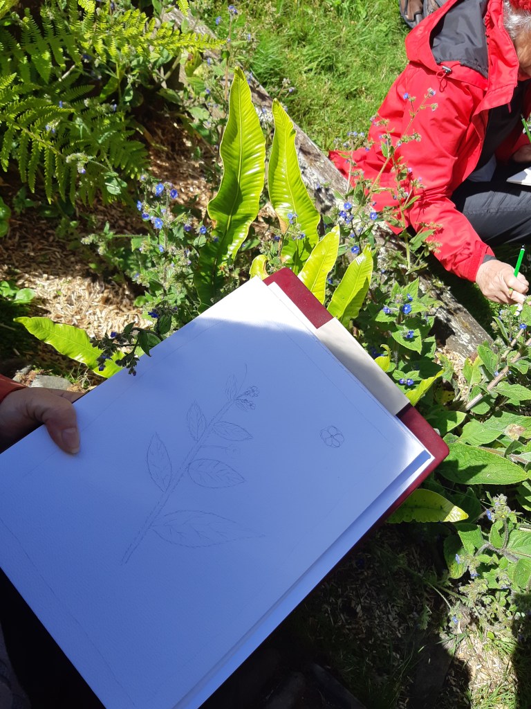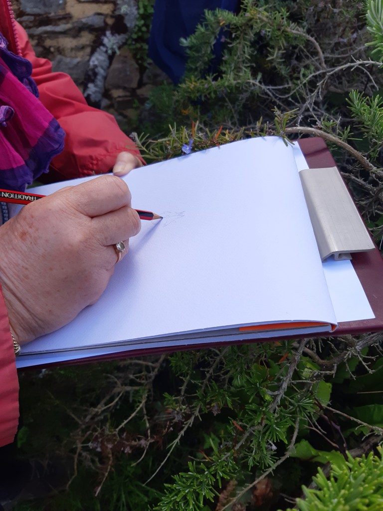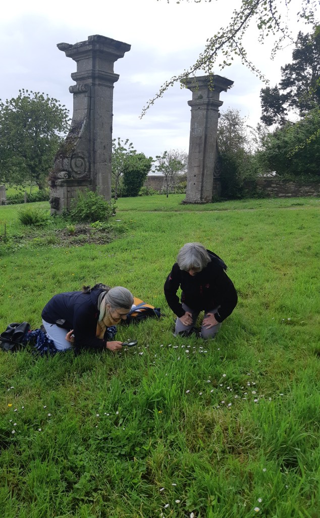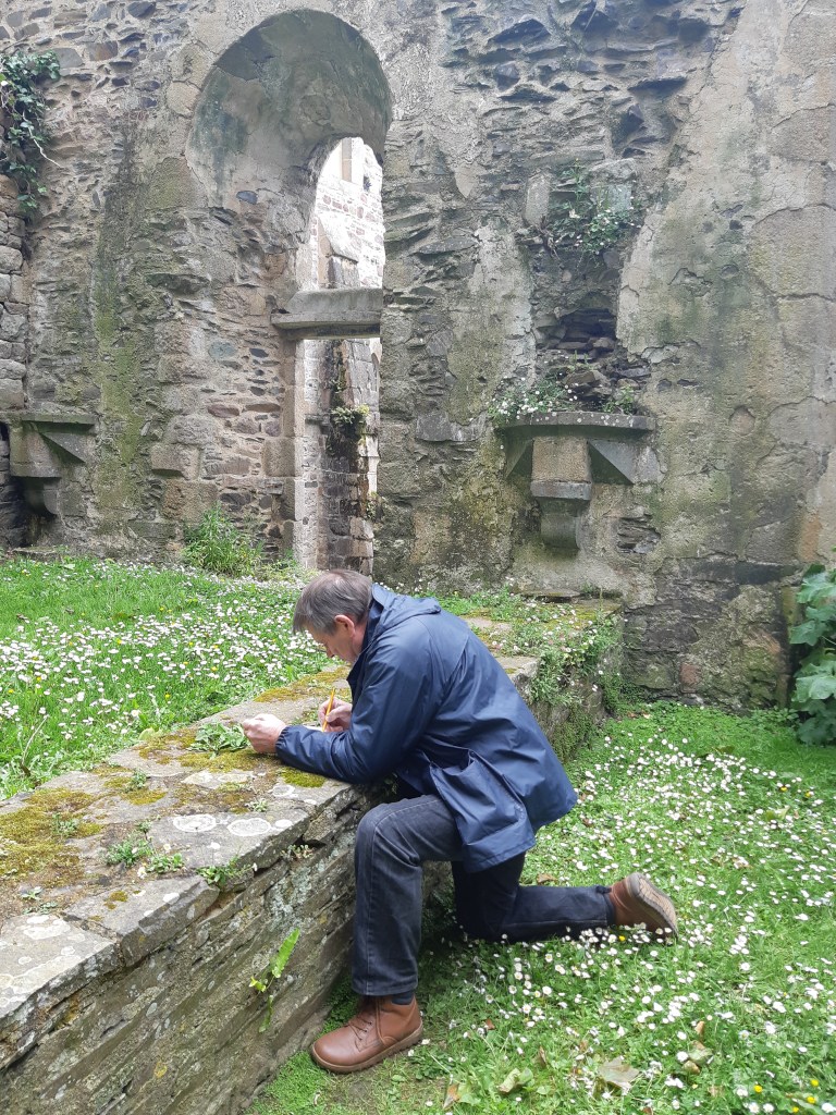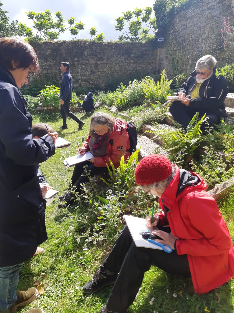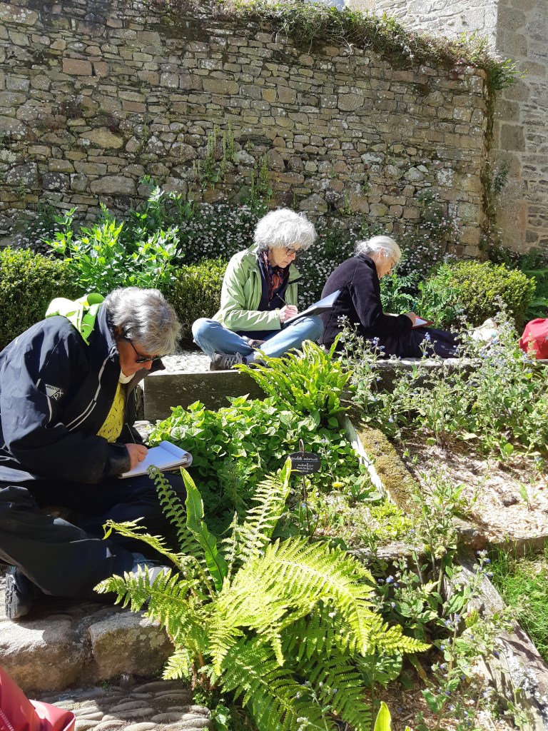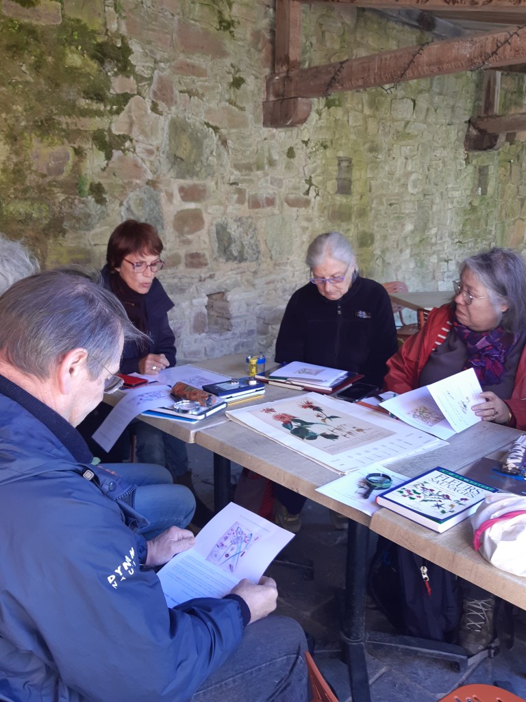 Après une discussion plus théorique autour d’une boisson chaude, les participant(e)s ont ensuite pu arpenter différents espaces de l’Abbaye, muni(e)s de leur loupe, de leurs crayons et de leur carnet pour apprendre à observer et dessiner les fleurs qui jonchaient le sol, que cela soit les pâquerettes du chauffoir, les buglosses du jardin des simples, ou encore le thym en fleurs du jardins clos.