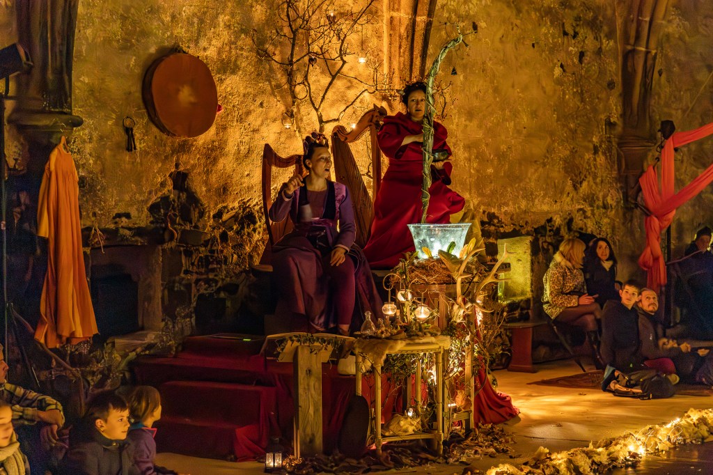 Herborescence déploie, sous les voûtes de la Salle au Duc, un songe de solstice : décor mystérieux, notes suspendues, tissus envoûtants et nous invite à franchir l’année… la tête en l’air.