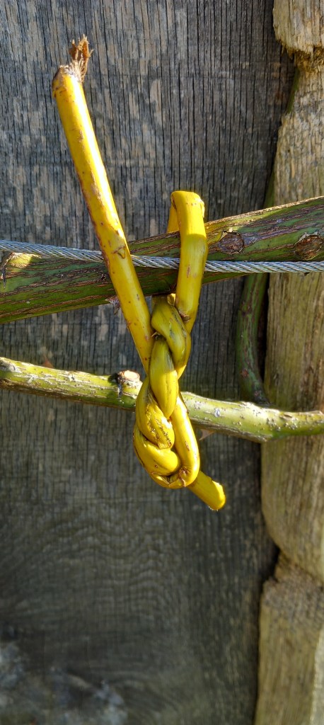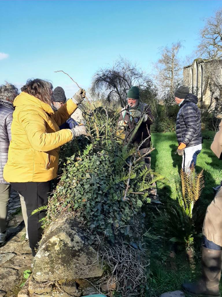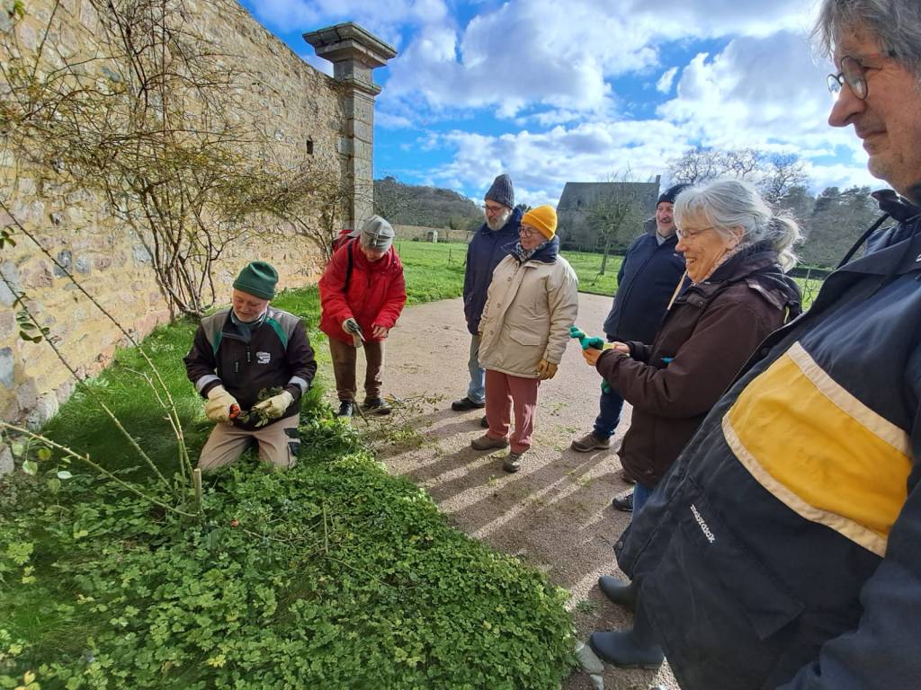 Petit plus pour cette année, Sylvain Mérard transmet aux volontaires sa technique de lien naturel en osier, permettant de tutorer les rosiers sans les abîmer.