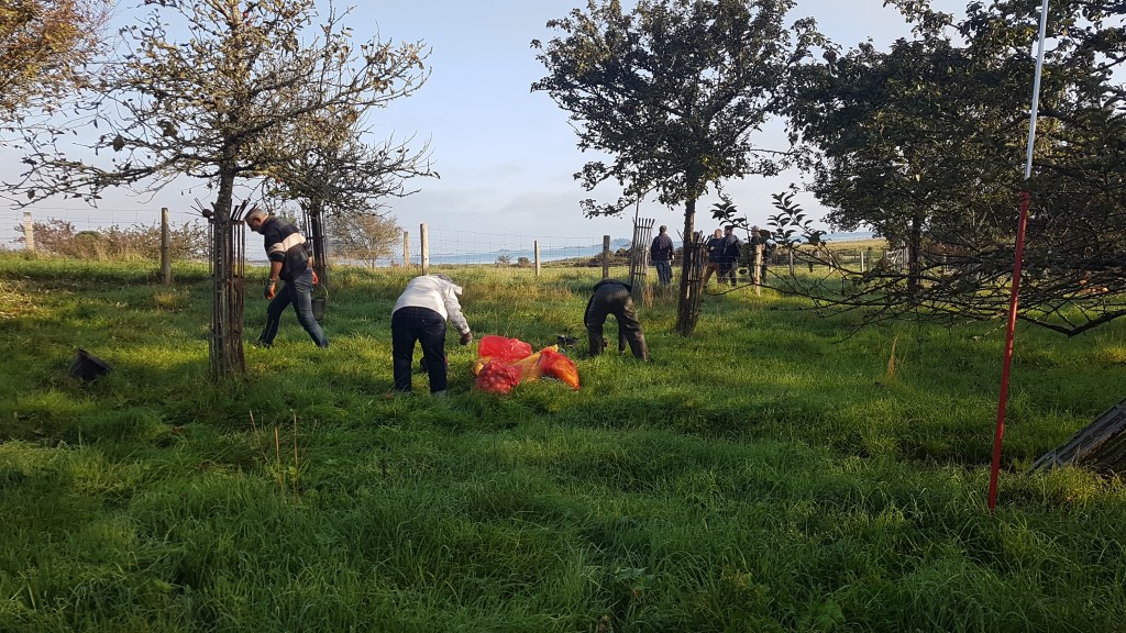 Alors chacun(e) remonte ses manches pour déposer les pommes récoltées dans les sacs dédiés accompagné par Jacques, le garde du littoral et Antoine le jardinier.